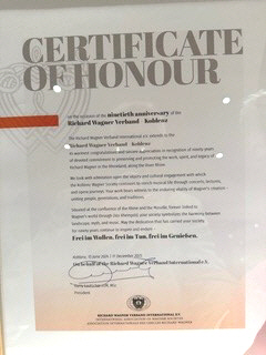 Ehrengast Harry Leutscher, Präsident von Wagnerverband International, erinnerte in einer Ehrenurkunde für den Koblenzer Verband nochmals an das 90jährige Bestehen und an das fortgsetzte kulturelle Engagement. Koblenz fand sich darin liebenswürdig poetisch verklärt: "Gelegen am Zusammenfluss von Rhein und Mosel, immer verbunden mit Wagners Welt durch 'Das Rheingold', symbolisiert Ihr Verband die Harmonie zwischen Landschaft, Mythos und Musik."